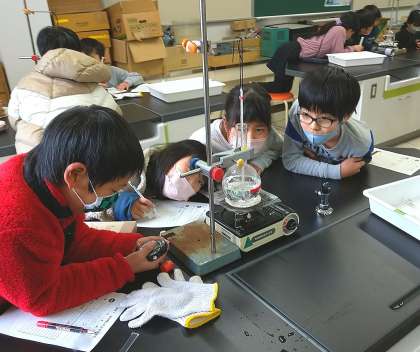 理科室で水を加熱した時の変化のようすを調べる実験をしていました。真剣そのものです。