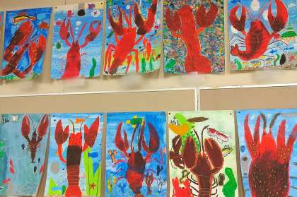2年生の子どもたちは、生活科の学習でアメリカザリガニを飼育しています。また、教科横断的な取組として、図画工作でも絵の題材として描いています。日頃、手に触れ大切に飼育している子どもたち自身のやさしい目線で描かれた作品は、いきいきとして素晴らしいですね。