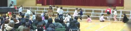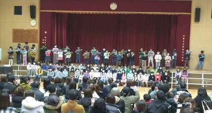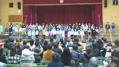 学習参観の第2日目。2年生が5時間目に発表を行いました。振り返りビデオの放映の後、学級ごとの発表や全体発表など多彩な発表形態を織り交ぜ、合唱や器楽演奏、バンブーダンス、詩の群読など、1年間取り組んできたことの一部をお見せすることができました。