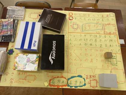 どのような仲間に分けたかの説明も、「長方形ばっかり」「正方形と長方形が両方ある」と言って、グループで相談しながらまとめていました。