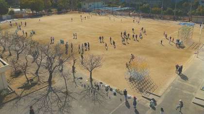 卒業式に向けての練習を頑張っている6年生。昼食のあとは、学年の先生方の粋な計らいで、運動場で思い思いに過ごすことになりました。創立40周年記念ベンチに寝っ転がって読書する人。先生や友だちと語らう人。ドッジボールに汗する人。ちょっと一息ですね。1年生たちも飛び出してきましたよ。
