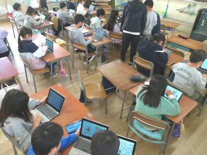 3年生はシャッフル授業といって、一部の教科で学年内専科授業を行っています。総合の時間もその一つで、今日はビスケットという簡単なプログラミングアプリケーションを活用して、アニメーションや簡単なゲームなど、思い思いに取り組んでいました。