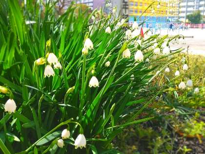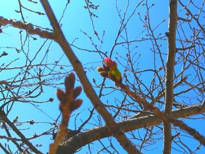 大阪城公園では三分咲きとのことですが、校庭のソメイヨシノは、つぼみがふくらんできたところです。今週の雨の後は、一気に開花するのではないでしょうか。正門付近のオオシマザクラは、ちらほら咲きです。中庭のオオマツユキソウは、可憐な白い花をつけています。