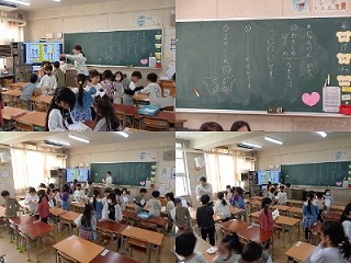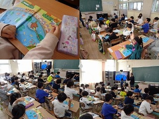 2時間目の学習の様子です。1組は算数で「なにがいるかな」に取り組んでいました。教科書の挿絵をみて、描かれている動物の種類を指定し数をかぞえる内容の学習でした。指名された子どもは、モニターの前で指定した動物の数を発表していました。2組は国語の「よろしくね」に取り組んでいました。2人で組になり、ジャンケンをして勝った人から、相手に「わたしのなまえは〜です。すきなものは〜です。」と自分を紹介することにチャレンジしていました。