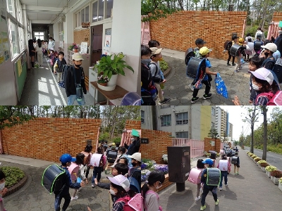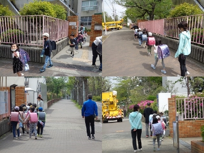 下校の様子です。1年生は学校生活に慣れていないということから、先生が引率して同じ方向の子ども同士がかたまって帰宅をする、集団下校を行っています。
