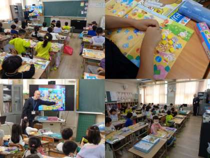 1年生の学習の様子です。1年生も1組、2組ともに算数の学習をしていました。「10までのかず」について考える学習です。5のかたまりについて考えたり、教科書のさし絵にブロックを置いて数を確かめたりすることに取り組んでいました。