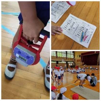 体育館では、20mシャトルランの終了後に、「握力」「反復横とび」「長座体前くつ」「立ち幅とび」の測定が行われました。
