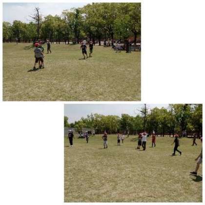 芝生広場で、学級ごとに「みんな遊び」をしています。