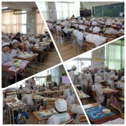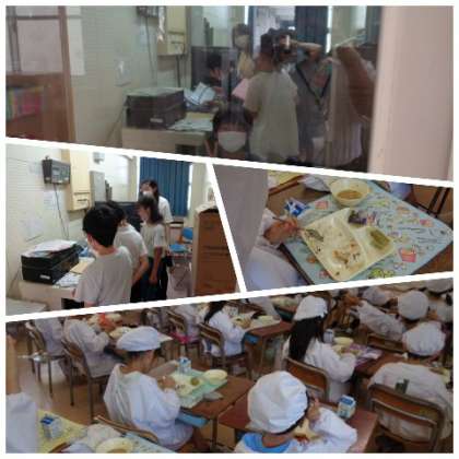 給食時間の様子です。給食の時間には給食委員会や放送・広報委員会の人たちが毎日行う放送を聞きながら、食事をしています。