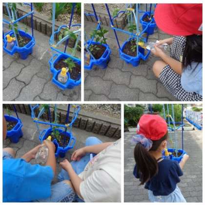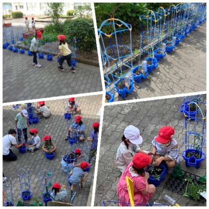 2年生が、昨年あさがおを育てた植木鉢にミニトマトの苗を植えました。植えた後は、植木鉢を中庭に並べて水をあげました。今日から大切にお世話をしながら、成長をしっかり観察していきましょう。