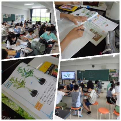 6年生が「植物のからだのつくり」の学習をしていました。色水につけた植物の変化のようすから、吸収された水の通り道について考えていました。