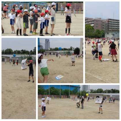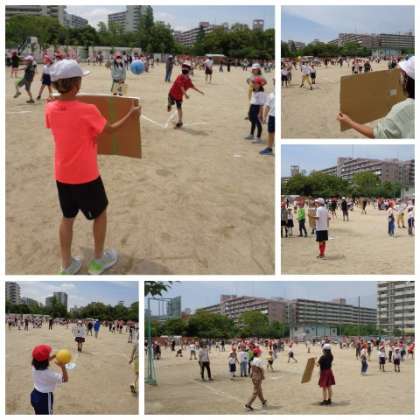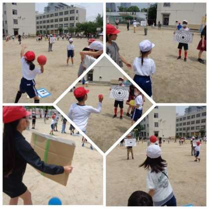 ドッジボール週間の取り組みの様子です。それぞれの班が、高学年の人が持つ的をめがけてボールを投げる練習を行っていました。正確に投げるコツなどをアドバイスしている姿が、あちらこちらで見られました。