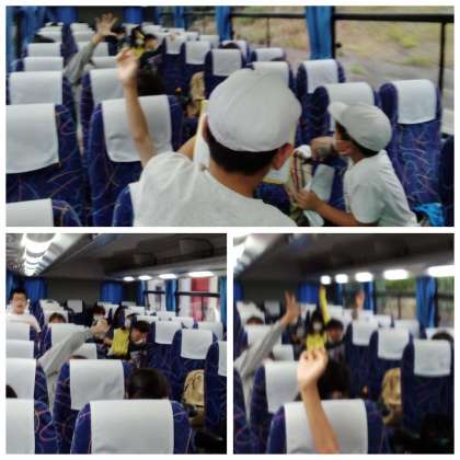 移動中の車内の様子です。バスレクとして、クイズ大会などで盛り上がっています。