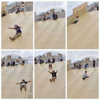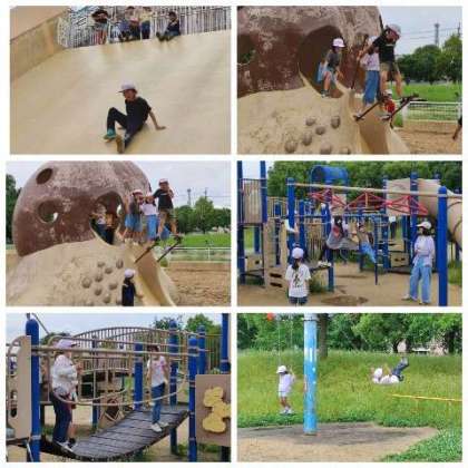 冒険ランドは、天気のおかげで貸し切り状態です。みんな、遊具を満喫することができました。