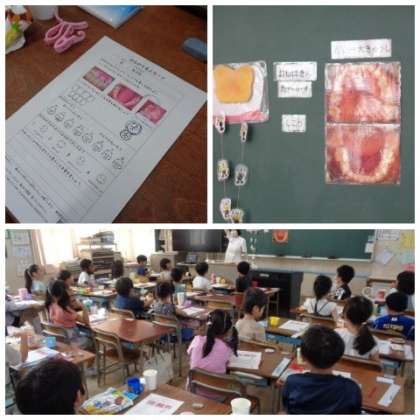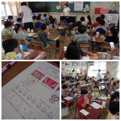 2年生で歯みがき指導を実施しました。歯科衛生士の先生に、歯みがきの大切さや正しい歯みがきの仕方について教えていただきました。
