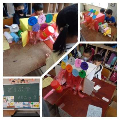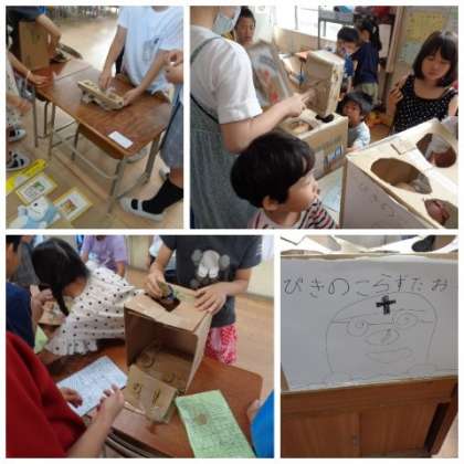 2年生は、手作りした「モグラたたき」や「どうぶつパニック」「コインつかみ」などのゲームで遊べるお店を出していました。どのゲームもとても工夫されたものでした。
