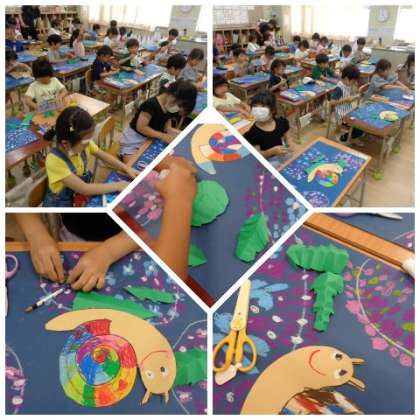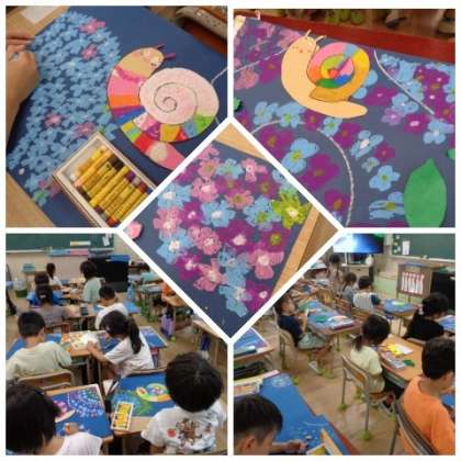 先日お伝えした、1年生のアジサイの絵が仕上がってきていました。カラフルなカタツムリや画用紙で作った葉っぱのレイアウトなどを考えながら、作品作りに取り組んでいました。