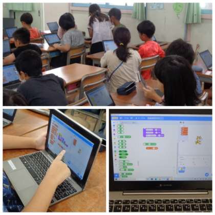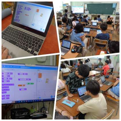 4年生が「スクラッチ」を使って、プログラミングの学習に取り組んでいました。画面上のイラストが自分のイメージ通りに動くように、考えながら命令のブロックを並べていました。