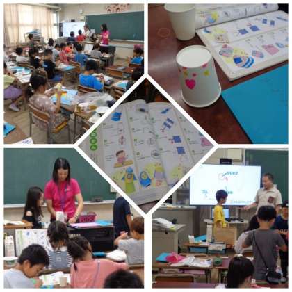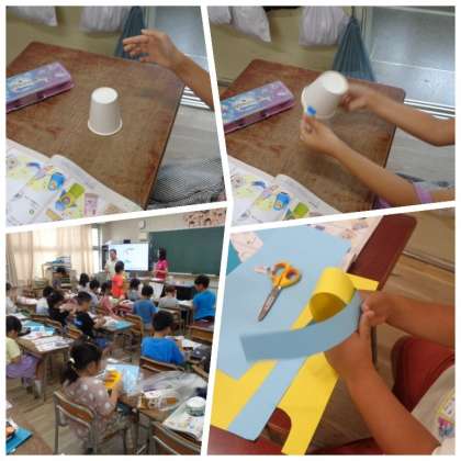 2年生が生活科の学習でおもちゃ作りに取り組んでいました。紙コップや輪ゴムなどの材料を使って、動いたり跳んだりするおもちゃを手作りしていました。