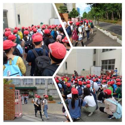 5年生が食や防災に関する体験学習として、ハグミュージアムに行きました。ハグミュージアムでは、職八重子に関する講義を受けたり、調理や防災の実習に取り組んだりする予定です。まずは、出発の様子です。