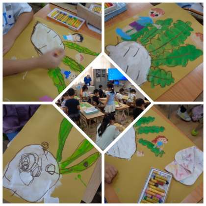 1年生が国語で学習している「大きなかぶ」のお話をモチーフにして、絵を描いていました。画面いっぱいに大きなかぶを描きこんで、そこに自画像などが配置された素敵な作品ができていました。