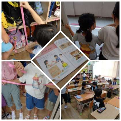 1年生が算数の学習で「ながさくらべ」に取り組んでいました。一定の長さに切った紙テープを教室のいろいろ場所にあてて、どちらが長いかを考えながら確認していました。
