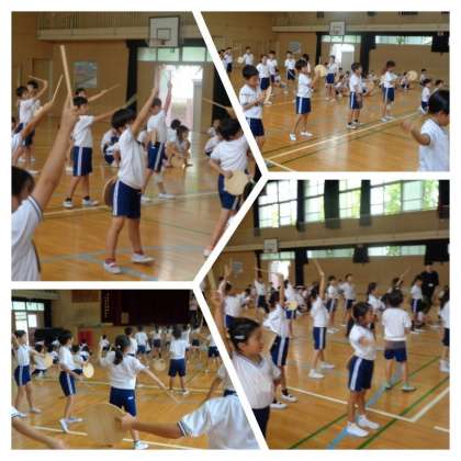 3年生が体育館で団体演技の練習に取り組んでいました。丸い木の板に木の棒を打ち付けながら踊っていました。音と動きが合うように、何度も繰り返し練習していました。