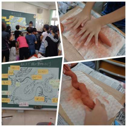 4年生が図画工作科で来年の干支である龍の置物づくりに取り組んでいました。想像上の生き物である龍について、制作する上でのポイントをていねいに確認をしながら、作品作りへの意欲を高めていました。