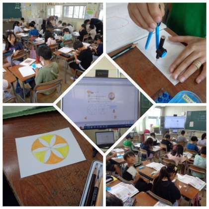 3年生がコンパスで描いたもようを使うコマづくりに取り組んでいました。コンパスの針を置く場所に悩みながらも、複雑な模様を上手に描くことができていました。描いたもように色を付け、コマに仕上げていきます。