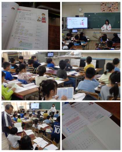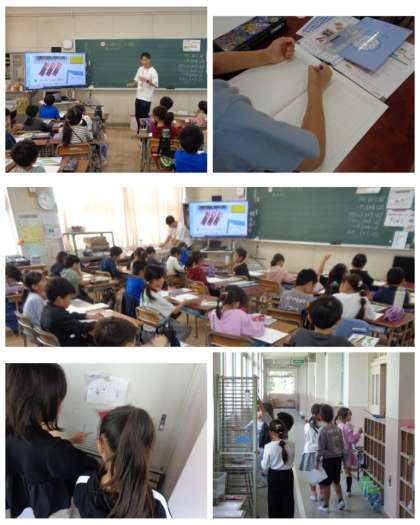 2年生が算数でかけ算の学習に取り組んでいました。教室のまわりにあるものから、かけ算を使うと数えやすくものを見つけたり、2×〇のかけ算のひみつを考えたりしていました。