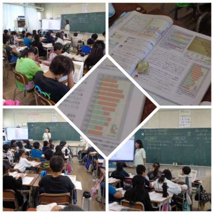 5年生が社会科で食料の生産について考えていました。ある野菜の国産と輸入の割合を月ごとに示したグラフを見ながら、時期による違いの理由を考え、意見の交流をしていました。