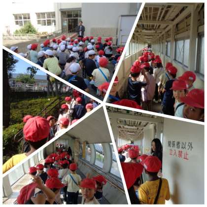 2年生が社会見学で、中ふ頭駅に隣接するニュートラムの車庫に出かけました。中庭に集合して、歩いて車庫に向かいました。到着すると、会議室に案内されて見学の説明を受けました。安全のため、検車場の見学に行く前に、全員ヘルメットを着用しました。