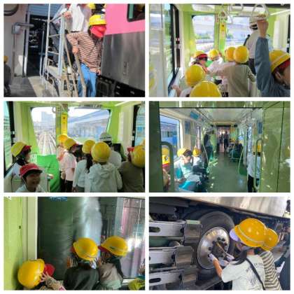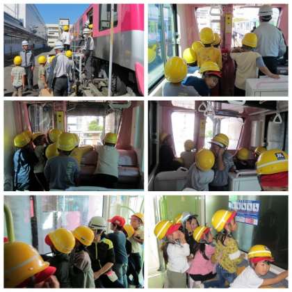 作業体験に続いて、車両の洗車の様子を見学しました。外からの見学ではなく、乗車して中から見させていただきました。子どもたちは、ブラシの大きさや作業中の音の迫力に、驚きながらも歓声をあげていました。子どもたちは、数々の珍しい場面を見学することができて、充実した時間を過ごすことができました。検車場の職員のみなさま、お忙しい中見学にご協力いただきありがとうございました。