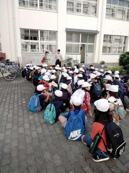 4年生が阿倍野防災センターに社会見学に行きました。阿倍野防災センターでは地震による揺れの体験や防災についての学習をする予定です。中庭に集合してから、防災センターに向けて出発しました。
