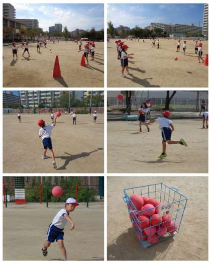 2年生が体育でボールを使った学習に取り組んでいました。ドッジボールを高く投げ上げて、落ちてきたところをキャッチをする練習や、ペアで投げ合う練習などをしていました。