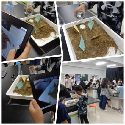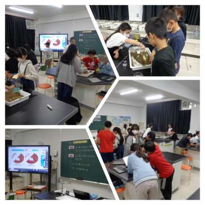 先日の運動場での実験に続き、5年生が理科室で自分たちで作った装置をもとにした流れる水のはたらきを調べる学習に取り組んでいました。理科の学習では、課題解決の手立てを考え、実験を通して考察をする場面が多くあります。