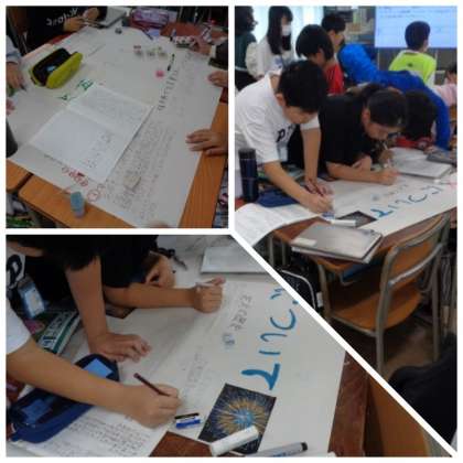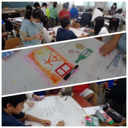 5年生が和の文化について調べたことを、大きな模造紙にまとめる学習に取り組んでいました。それぞれが設定したテーマについて分かったことを、わかりやすく伝えるための工夫を考えながら、作業を進めていました。