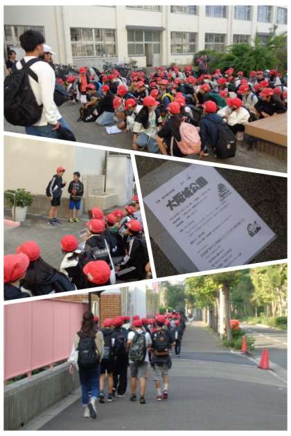 5年生が大阪城に遠足に行きました。はじめに学校出発の様子です。代表の子どもの進行で、付き添いの先生の紹介や諸注意のあと、目的地に向けて出発しました。