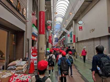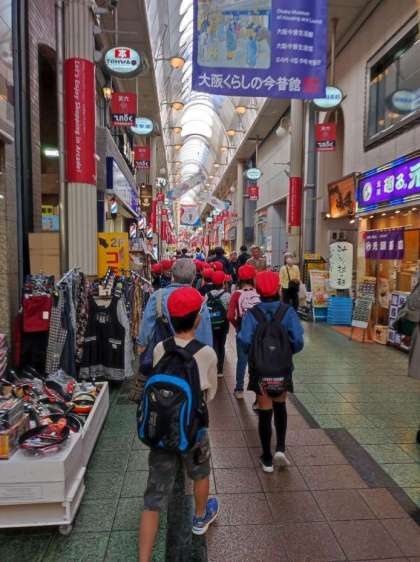 くらしの今昔館での活動を終えて、日本一長い天神橋筋商店街を見学しながら、扇町公園に向かいます。