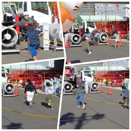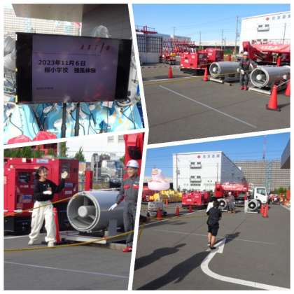 引き続きアクティオでの活動の様子です。SFファンという大型の送風機を使って、風速30メートルという、強い風を受ける体験をしました。