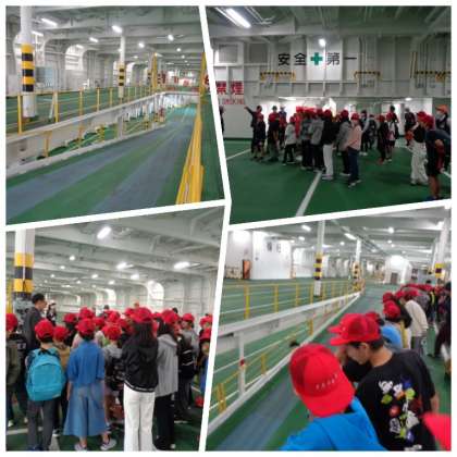 さんふらわあの見学の様子です。はじめに徒歩では立ち入ることのできない車載デッキで、船に関する説明を聞きました。車が1台も置かれていないデッキは、船の中とは思えない広さがありました。