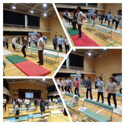 学校保健委員会の一環として、放課後に教職員や保護者・地域の方々を対象にした、保健研修会が行われました。子どもたちと同様に、体幹を鍛える方法などを実践しながら、健康な体つくりについて学びました。
