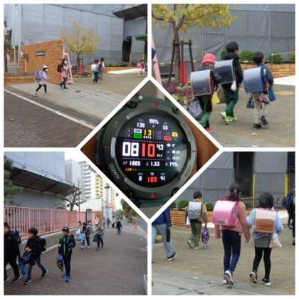 曇り空の下での登校風景です。先週の暑さから一変して、冬の訪れすら感じられる寒い朝になりました。子どもたちの装いも、すっかり冬仕様に変わりました。これだけ気候の変化が激しいと、体調の維持が難しくなります。寒さに負けず、今週も元気に過ごしましょう。今週は、木曜日に3年生が住之江消防署に見学に行きます。金曜日には6年生の遠足も予定されています。