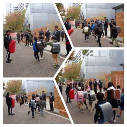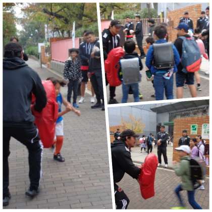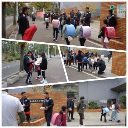 本日地元のラグビーチームである「レッドハリケーンズ大阪」の選手の皆さんとの交流を行いました。交流の内容は2・3・4年生を対象にしたラグビー教室と登校時のあいさつ運動でした。あいさつ運動では選手の皆さんが正門に立ち、子どもたちとあいさつを交わしました。あいさつだけではなく、ボールを触らせてもらったり、タックルを体験させていただいたりもしました。