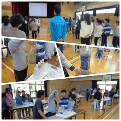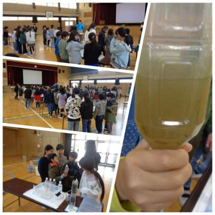 3時間目と4時間目に4年生で水道教室が行われました。水道教室とは、大阪市の水道局が行っている出前授業です。水道教室では、水道水に使われている淀川の水を浄化する仕組みについて、実験を通して学習します。はじめは濁っていた水が、浄化装置を通すことで透明になる様子を、子どもたちは興味深く観察していました。