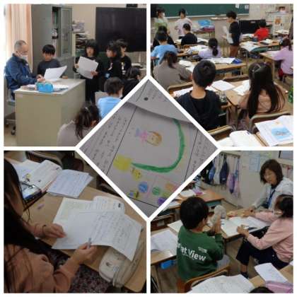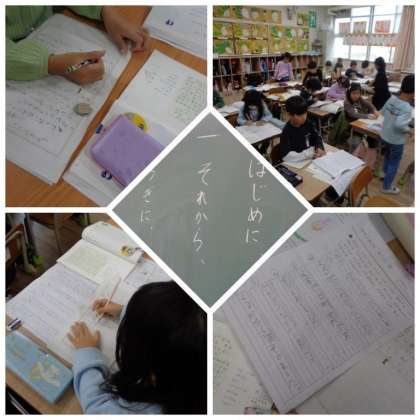 1年生が作文の学習に取り組んでいました。思い出に残る出来事を題材にして、つなぎ言葉のはたらきに気をつけながら作文していました。