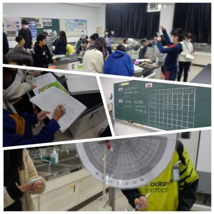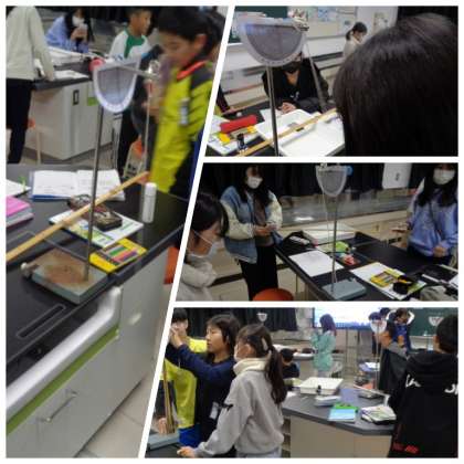 5年生が理科室で、ふりこについて学習していました。ふりこの長さと1往復する時間の関係について、実験を通して考えていました。