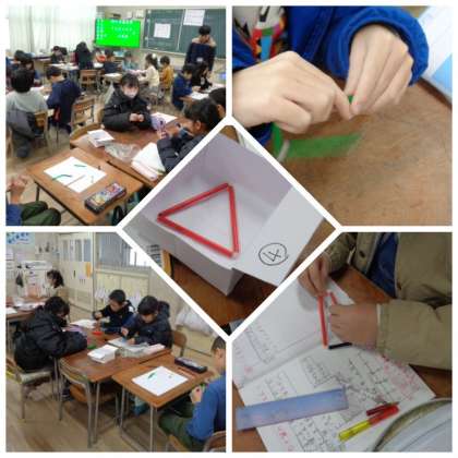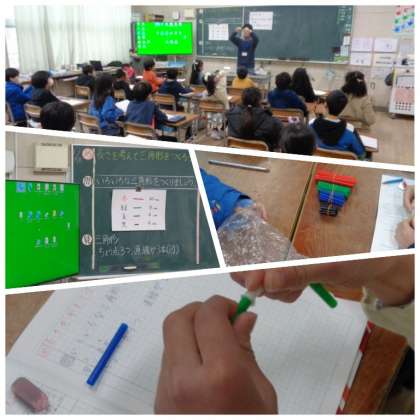 3年生が算数で三角形の学習に取り組んでいます。長さと色の違うパイプとモールを使って、いろいろな形の三角形を作っていました。出来上がった形の特徴などを話し合いながら学習を進めていました。