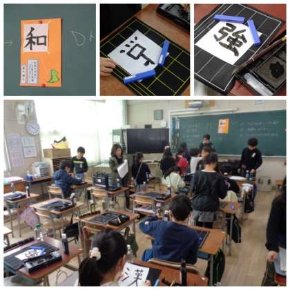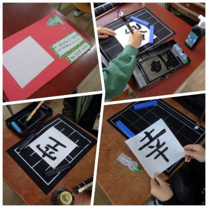3年生は正方形に切った半紙に、今年の抱負を一文字の漢字で表す方法で、目標を考えていました。目標にふさわしい文字を上手に選択しながら、筆を使って書き表していました。