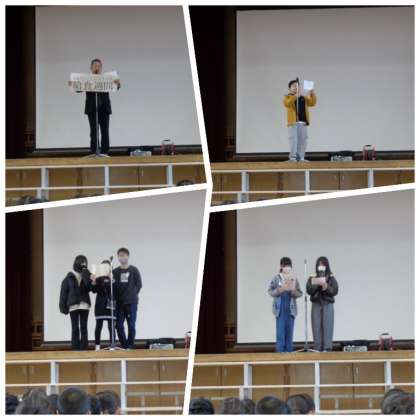 今週の児童朝会は、初めに読書感想文のコンクールで賞をもらった人の表彰がありました。校長先生のお話は「給食週間」に関するものでした。保健、給食、環境の各委員会のお知らせに続いて、児童会から、南港桜小学校のキャラクター名決定の報告がありました。係の先生のお話は「あいさつ」についてでした。